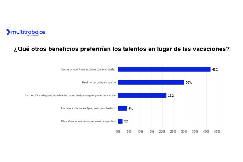 Según el estudio Vacaciones 3.0 de Multitrabajos, el 52% de las personas trabajadoras en Ecuador prefiere recibir otros beneficios laborales en lugar de vacaciones, el porcentaje más alto de la región. Esta preferencia supera a países como Perú (44%), Panamá (32%), Argentina (22%) y Chile (21%). Entre los beneficios más valorados, el 42% optaría por bonos o incentivos económicos adicionales, el 30% prioriza un mejor sueldo, y el 22% elegiría beneficios de flexibilidad laboral como el home office. En menor proporción, el 4% prefiere trabajar por objetivos sin horarios fijos y el 2% valora contar con días libres sin motivo específico.