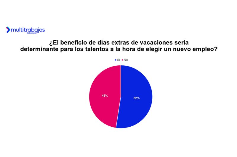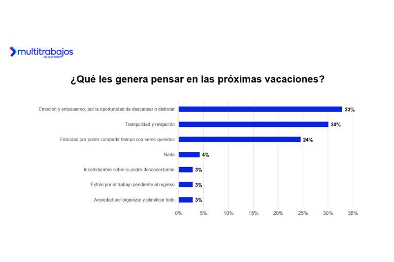 Finalmente, el 52% de los talentos considera que contar con días adicionales de vacaciones es determinante al elegir un nuevo empleo, y el 93% cree que este beneficio debería ser ofrecido por todas las organizaciones. Pensar en las próximas vacaciones genera emoción y entusiasmo en el 33%, tranquilidad en el 30%, y felicidad por compartir con seres queridos en el 24%.