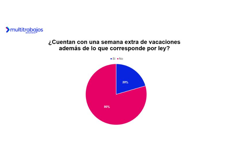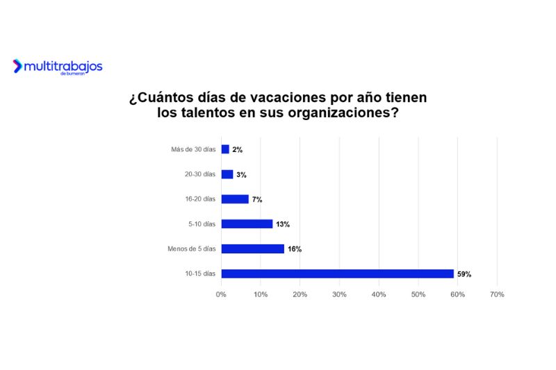 En cuanto a la cantidad de días de vacaciones, el 59% indica que dispone de entre 10 y 15 días al año; el 16% tiene menos de 5 días; el 13% cuenta con entre 5 y 10 días; y solo el 7% disfruta de entre 16 y 20 días. Además, el 40% debe solicitar sus vacaciones con más de un mes de anticipación, el 25% con un mes, el 21% con una o dos semanas, y el 14% con menos de una semana. Aunque algunas organizaciones ofrecen una semana adicional de vacaciones, solo el 20% de los trabajadores en Ecuador cuenta con este beneficio, una cifra similar a la de otros países de la región.