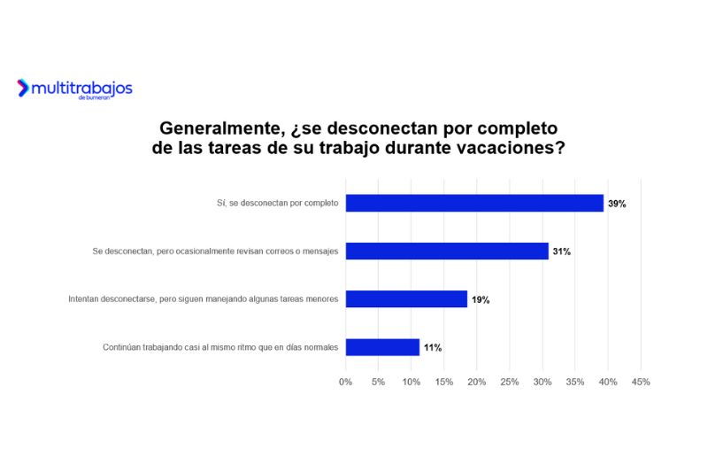 El informe evidencia también dificultades para desconectarse del trabajo durante el descanso: el 61% afirma que no logra desconectarse completamente, mientras que el 39% sí lo consigue. Entre quienes no se desconectan, el 31% revisa ocasionalmente correos o mensajes laborales, el 19% continúa gestionando tareas menores y el 11% mantiene un ritmo de trabajo casi normal. Las principales razones son el deseo de estar informados (32%), la insistencia de compañeros o líderes (24%), el temor a la acumulación de tareas (23%) y el miedo a perder el empleo (16%). En total, el 76% revisa su correo o celular laboral durante las vacaciones, el 36% siente ansiedad si no lo hace y el 15% experimenta culpa al disfrutar de su descanso.
