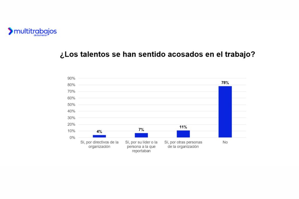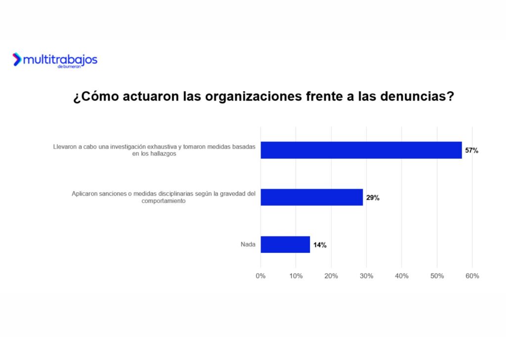 El informe también aborda la contracara de las relaciones laborales: el 22% de las personas trabajadoras afirma haber sufrido acoso en su organización. De estos casos, el 11% provino de pares, el 7% de líderes o supervisores y el 4% de directivos. Frente a estas situaciones, el 76% no realizó ninguna acción, el 11% cambió de trabajo, el 9% acudió a Recursos Humanos y solo el 4% presentó una denuncia.
