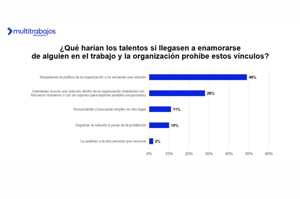 Si una persona se enamora de un colega y la empresa prohíbe este tipo de vínculos, el 49% respetaría la política y no iniciaría la relación, el 28% buscaría una solución interna con Recursos Humanos o superiores, y el 11% optaría por renunciar y buscar otro empleo.