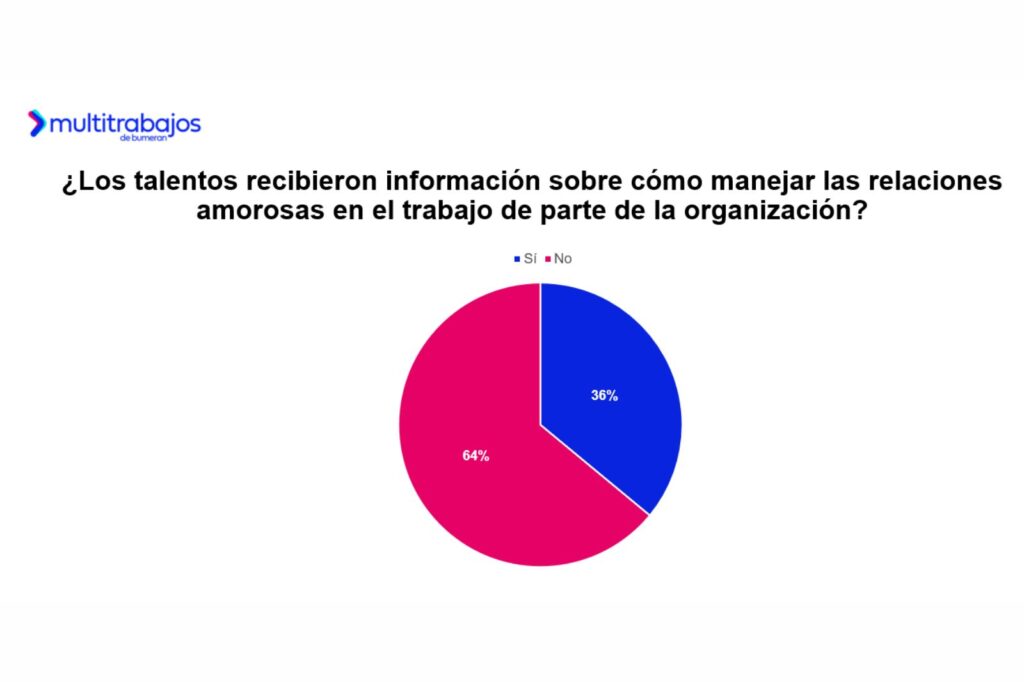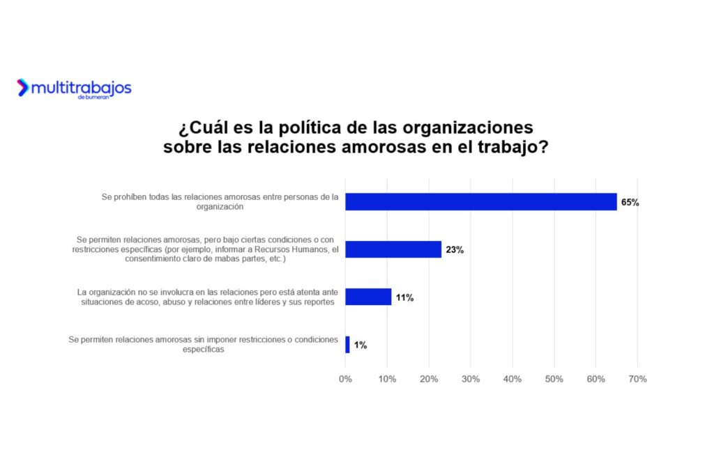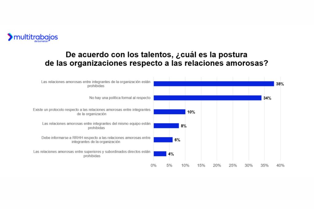 Respecto a las políticas internas, el 38% de los trabajadores indica que las relaciones amorosas están prohibidas, el 34% señala que no existe una política formal, el 10% menciona la existencia de un protocolo específico, el 8% afirma que están prohibidas entre integrantes del mismo equipo y el 6% indica que deben informarse a Recursos Humanos.