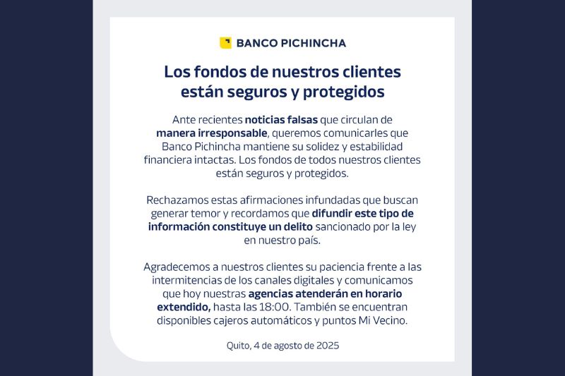 Banco Pichincha informó que mantiene su solidez y estabilidad financiera, y que los fondos de todos sus clientes están seguros y protegidos. La entidad emitió este pronunciamiento ante la circulación de noticias falsas que, según indicaron, buscan generar temor de manera irresponsable. Además, recordaron que difundir este tipo de información constituye un delito sancionado por la ley ecuatoriana.
