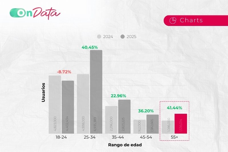 El gráfico evidencia un cambio estructural en la base de usuarios de TikTok en Ecuador. Aunque el total de cuentas 18+ crece 20,8% interanual, el motor principal ya no son los jóvenes: los segmentos de 35 a 55+ concentran los mayores incrementos, con crecimientos que superan el 36% y alcanzan más del 41% en el grupo 55+, consolidando una audiencia más adulta y diversa.