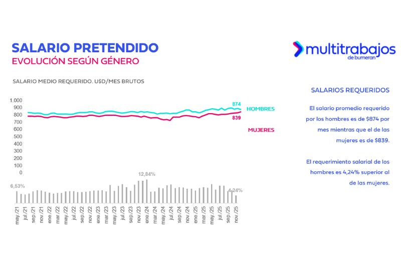En noviembre de 2025, la brecha salarial por género se ubicó en 4,24%, a favor de los hombres. El salario promedio solicitado fue de $874 para hombres y $839 para mujeres.