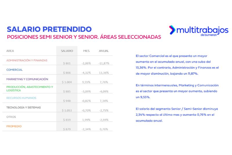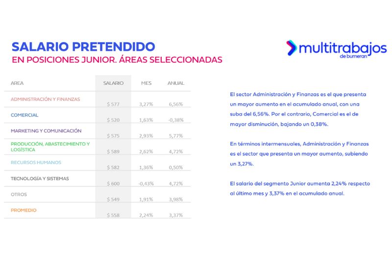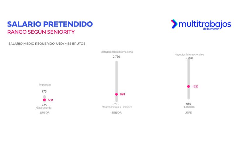 En el nivel junior, el puesto de Impuestos encabezó la lista con una pretensión de $775. En el extremo inferior, Servicios fue el cargo con menor salario pretendido en jefe o supervisor ($650); en semi senior y senior, Mantenimiento y Limpieza ($513); y en junior, Gastronomía, con $475.