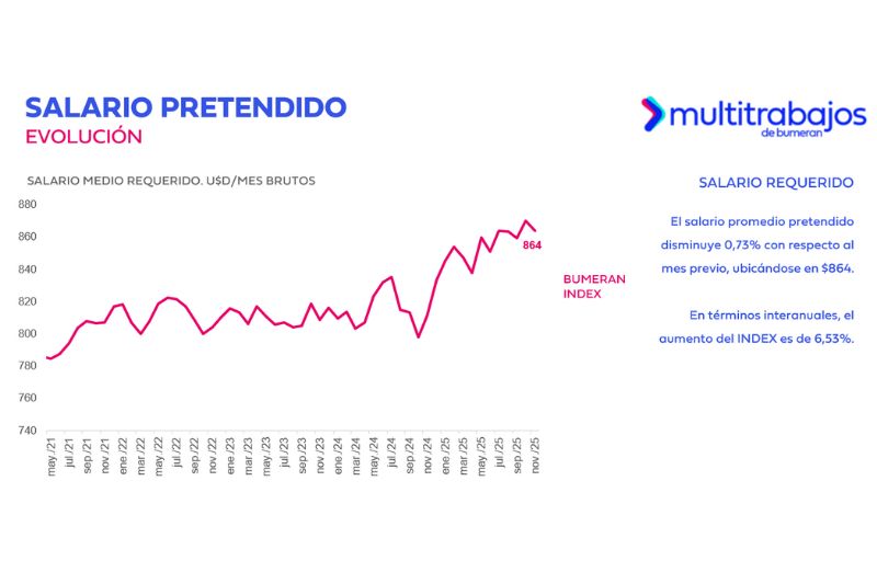 En noviembre de 2025, el salario promedio pretendido por los ecuatorianos se ubicó en $864, según el último Index del Mercado Laboral de Multitrabajos, el portal de empleo líder en Latinoamérica. La cifra representa un incremento interanual del 6,53%, mientras que a nivel mensual registró una variación del 0,73%.