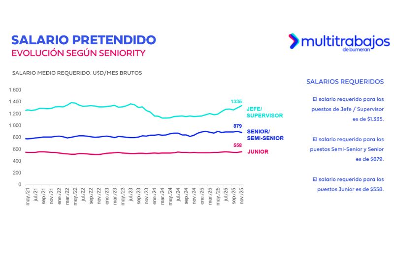 El análisis por nivel de experiencia muestra diferencias significativas. En noviembre, los roles de jefe o supervisor registraron un salario promedio requerido de $1.335, con un incremento del 2,82% frente al mes anterior. Este segmento concentra las expectativas más altas del mercado laboral.