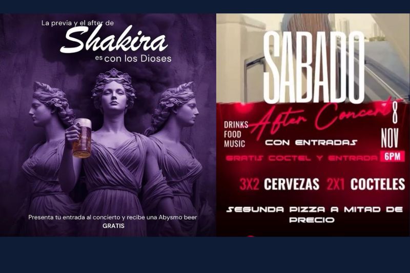 La fiebre por Shakira también se vivió fuera del estadio. Según Primicias, las pelucas moradas inspiradas en el video “Las de la intuición” se agotaron en varios locales de Quito horas antes del primer concierto. La ciudad se tiñó simbólicamente de violeta, mientras bares, restaurantes y cafeterías cercanas lanzaban combos temáticos, happy hours y descuentos mostrando la entrada del show, aprovechando el flujo de visitantes nacionales y extranjeros.