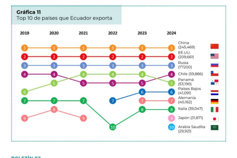 China se posicionó como principal destino de las exportaciones ecuatorianas, con un crecimiento del 41% entre 2019 y 2024.