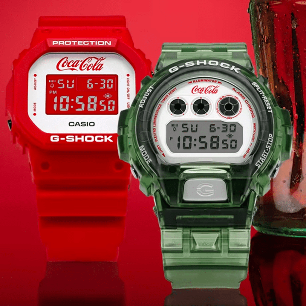 Formada por un DW-5600 y un DW-6900, ambas referencias de edición limitada se inspiran en la icónica bebida y se fusionan con la estética característica de G-SHOCK. Bañado en el característico tono rojo de Coca-Cola, el DW5600 presenta una esfera blanca. Para el modelo DW-6900, Casio se ha inspirado en las antiguas botellas de cristal para crear un brazalete de aspecto translúcido.