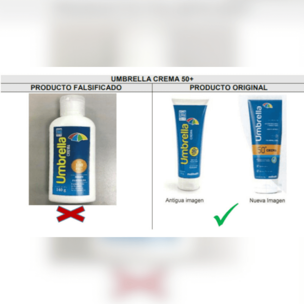 La Agencia Nacional de Regulación, Control y Vigilancia Sanitaria alertó sobre la falsificación de un protector solar que se vende en Ecuador. Lo hizo a través de una publicación en su cuenta de X: «La presente alerta se emite a partir del análisis y evaluación de la denuncia presentada por la empresa Megalabs-Pharma, quien identificó irregularidades en su producto original Umbrella Crema 50, el cual se está comercializando como Umbrella Crema”, sostiene Arcsa.