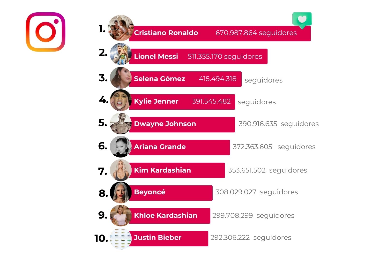 El bloque medio está dominado por figuras del espectáculo y la cultura pop como Kylie Jenner (391,5 millones), Dwayne Johnson (390,9 millones) y Ariana Grande (372,3 millones). Estas cuentas combinan entretenimiento, marca personal y negocios, convirtiendo Instagram en una plataforma clave para monetización e influencia comercial.