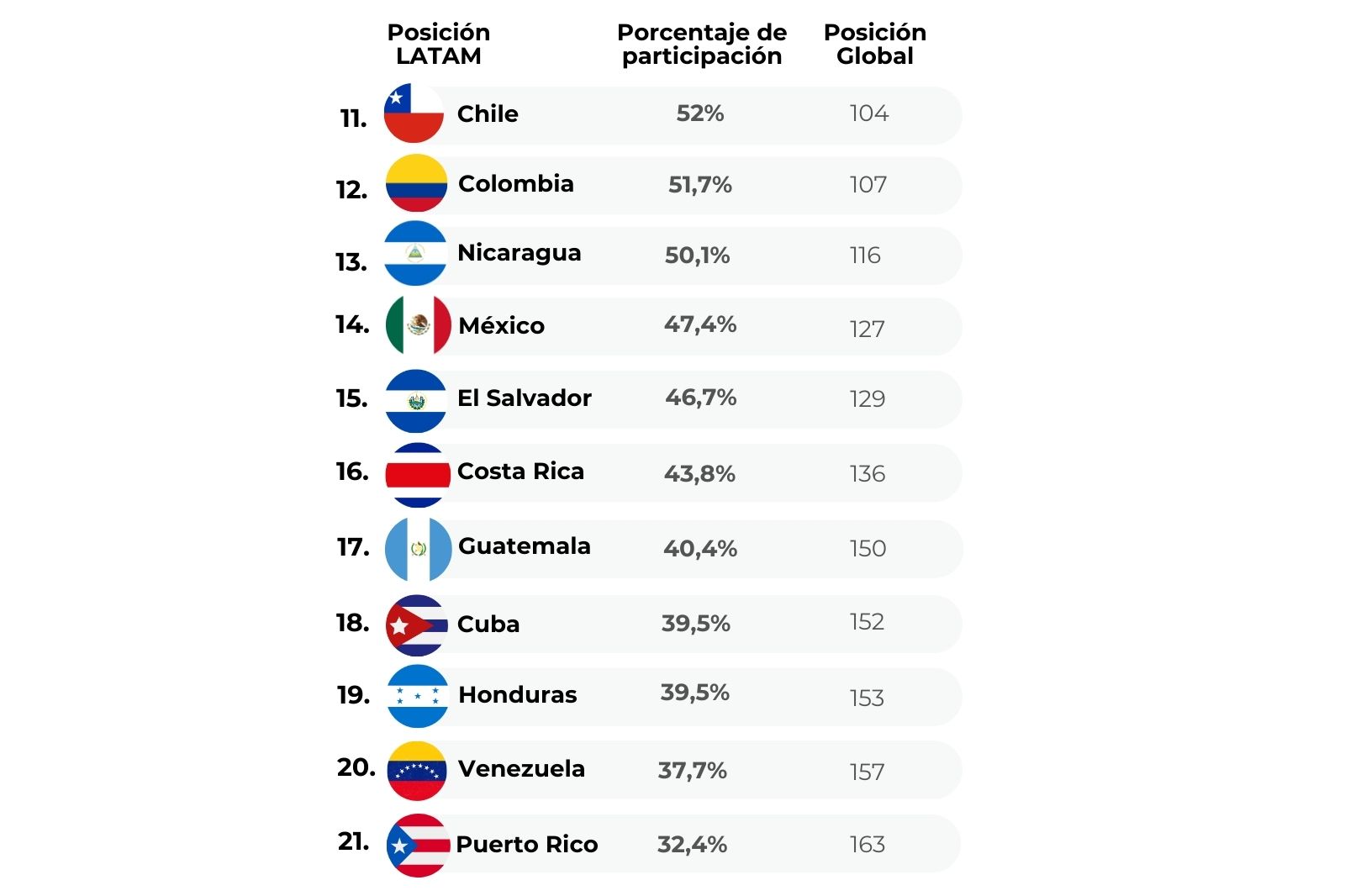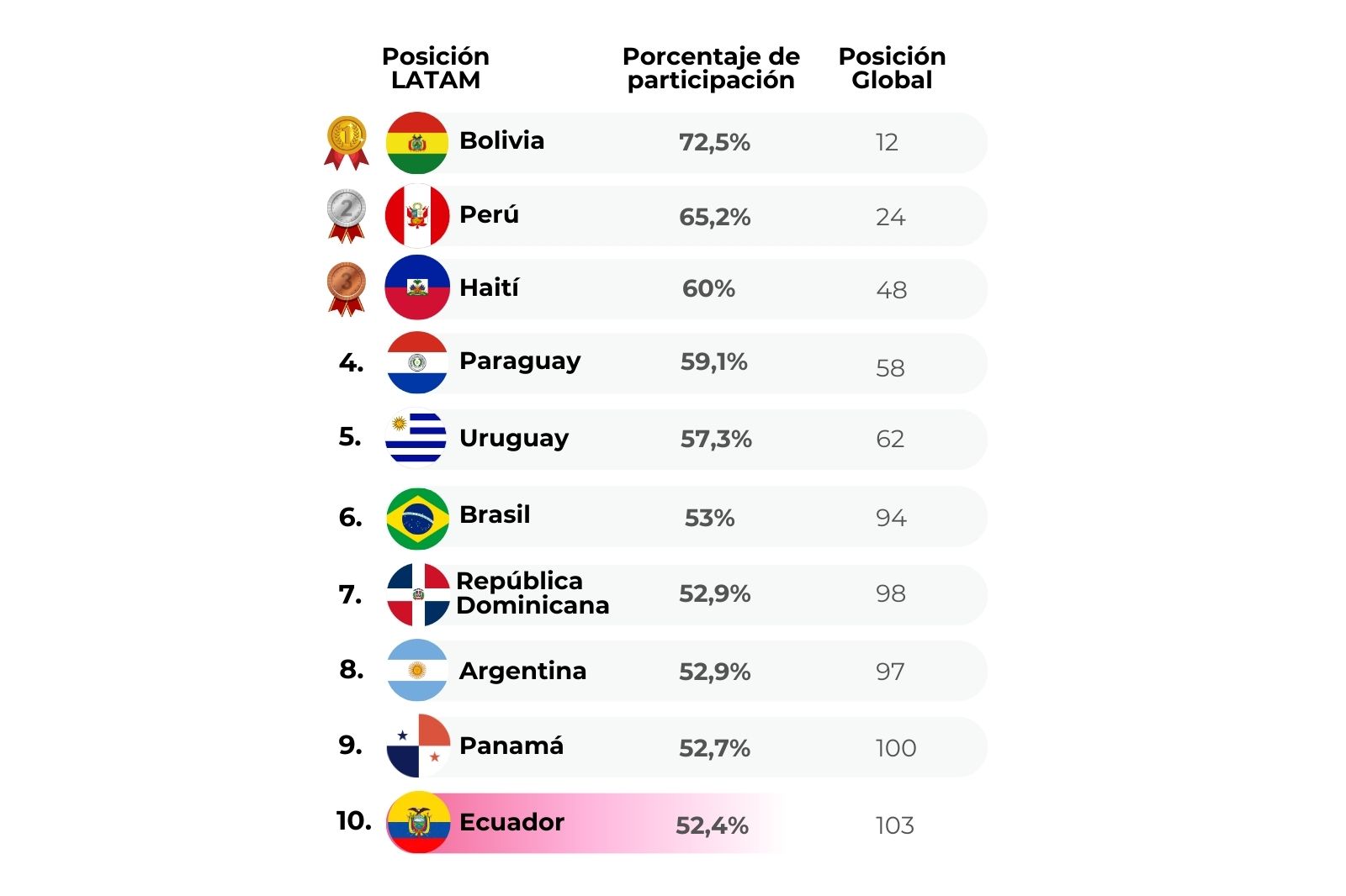 El análisis del ranking muestra que Bolivia (72,5%), Perú (65,2%), Haití (60%), Paraguay (59,1%), Uruguay (57,3%) y Brasil (53%) concentran los niveles más altos de participación femenina dentro del grupo analizado. En estos países, la elevada inserción laboral de las mujeres suele estar vinculada a dinámicas económicas donde el trabajo independiente, el comercio informal y los emprendimientos familiares tienen un peso relevante. Esto implica que una mayor participación no necesariamente se asocia con empleos formales o mejores salarios, sino con una mayor necesidad económica de incorporarse al mercado laboral, especialmente en economías con menor cobertura de protección social o ingresos familiares más inestables.