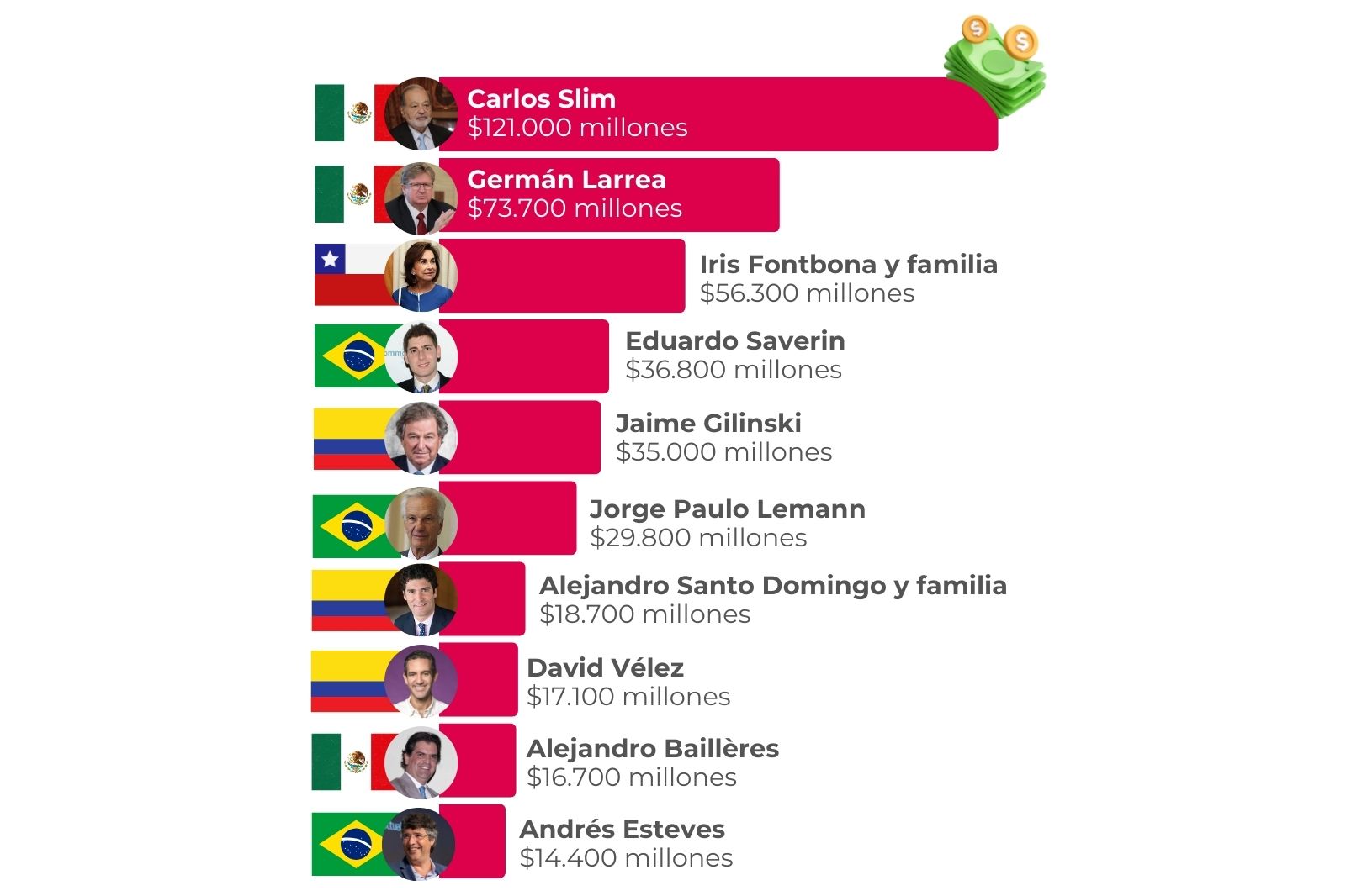 Carlos Slim encabeza la lista de las mayores fortunas de Latinoamérica, con un patrimonio estimado de $121 mil millones de dólares, gracias a sus negocios en telecomunicaciones, además de inversiones en industria y banca.