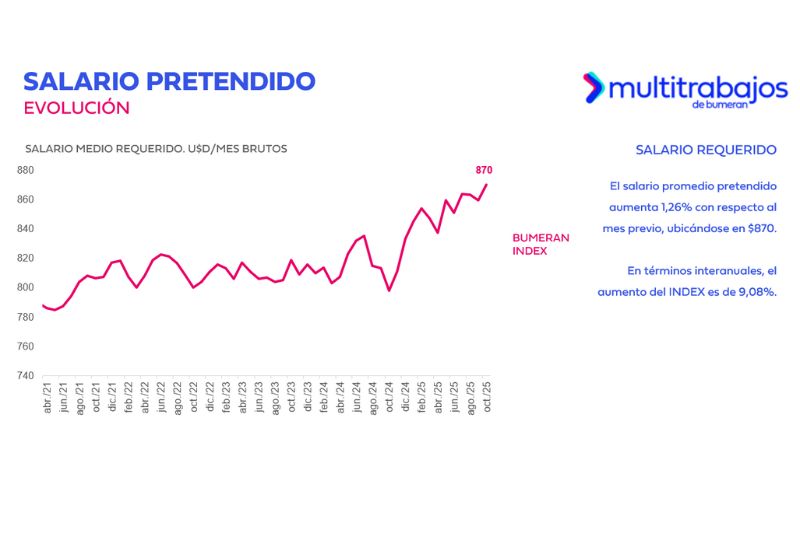 El último Index del Mercado Laboral de Multitrabajos confirma que el salario pretendido por los ecuatorianos llegó a $870, un incremento del 1,26% frente a septiembre. En términos anuales, la expectativa salarial creció 9,08%, lo que sugiere una recuperación moderada pero constante del valor que los trabajadores asignan a sus competencias.