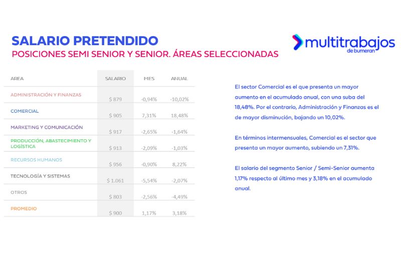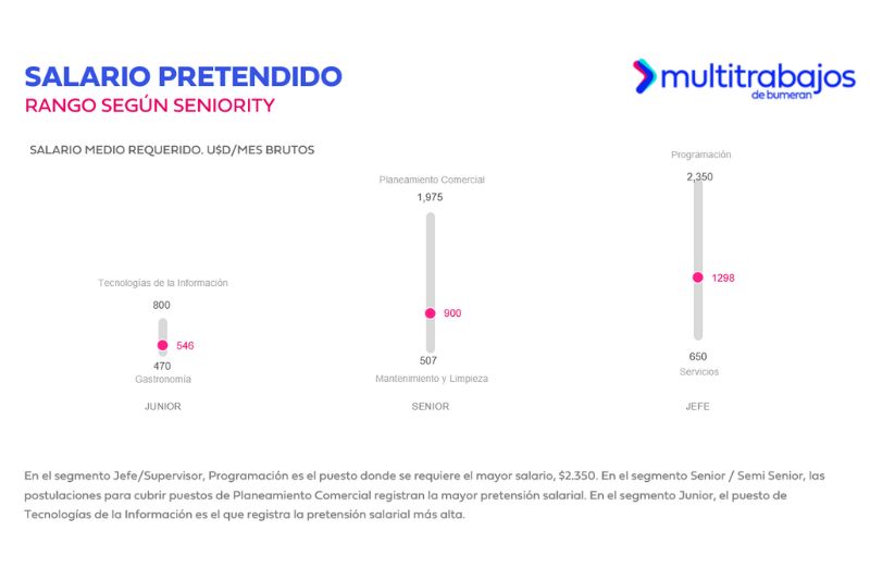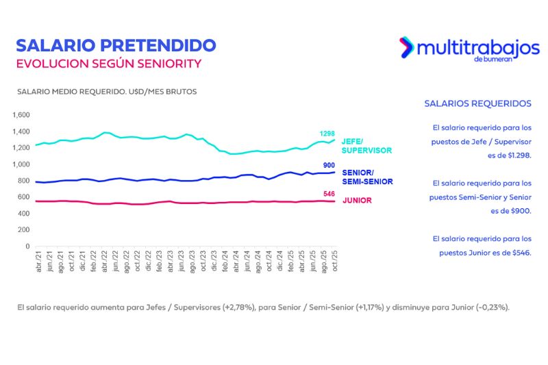 El reporte muestra contrastes entre niveles laborales. Los jefes o supervisores presentan un salario pretendido de $1.298, un incremento de 2,78% frente al mes previo. Para los niveles semi senior y senior, la pretensión llega a $900, con un aumento de 1,17%. En cambio, los niveles junior registran $546, una disminución del 0,23%.