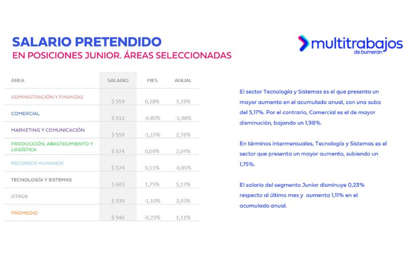 En el segmento junior, el área de Tecnología y Sistemas registra el salario pretendido promedio más alto: $603, mientras que el área Comercial presenta el más bajo ($512). Además, entre enero y octubre, Tecnología y Sistemas muestra el mayor incremento del nivel junior, con un +5,17%, mientras que Comercial registra un descenso del -1,98%.