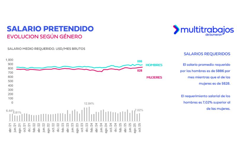En octubre, la brecha salarial según género alcanzó el 7,02% a favor de los hombres. Ellos solicitaron en promedio $886, mientras que las mujeres registraron $828. Esta diferencia continúa siendo un indicador crítico del mercado laboral ecuatoriano.
