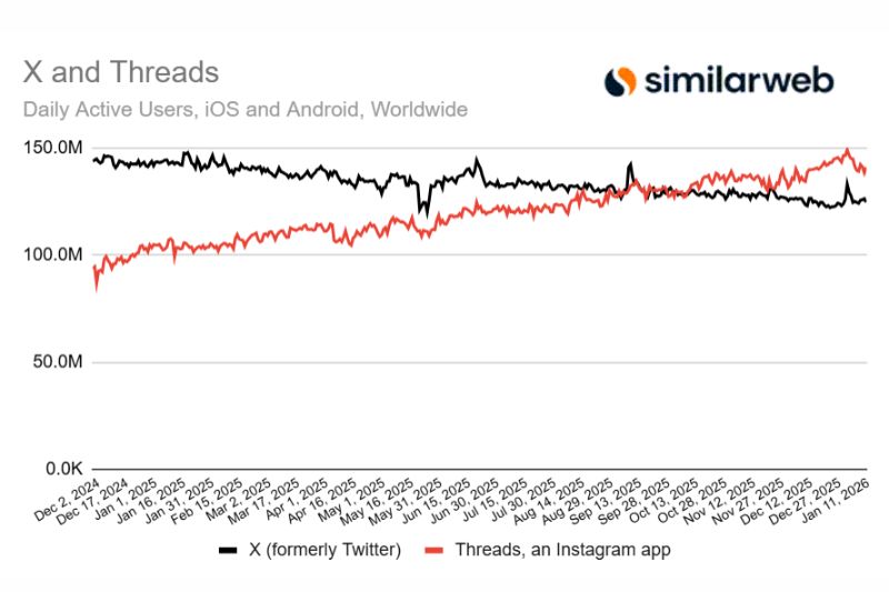 Resumen. Threads superó a X en usuarios diarios móviles, según datos de Similarweb. Al 7 de enero de 2026, la app de Meta registró 141,5 millones de usuarios activos diarios en iOS y Android, frente a 125 millones de X. El crecimiento se atribuye a promociones cruzadas, nuevas funciones y foco en creadores. No obstante, X mantiene ventaja en la web, con más de 145 millones de visitas diarias.