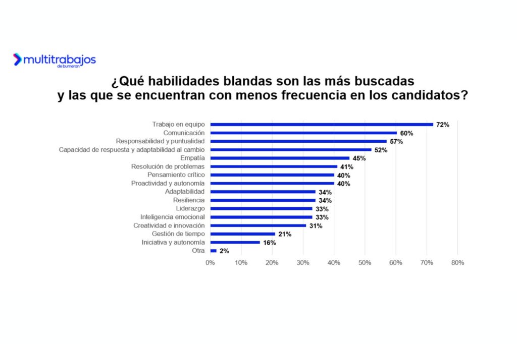 En este contexto, el 62% de los especialistas sostiene que las habilidades blandas son las más solicitadas, pero también las menos frecuentes entre los candidatos, evidenciando una brecha directa entre las necesidades empresariales y la disponibilidad real de talento con estas competencias. Esta tendencia se replica a nivel regional: Chile y Perú alcanzan el 69%, Argentina el 68% y Panamá el 57%, confirmando que el desafío de fortalecer habilidades interpersonales es transversal en Latinoamérica y se consolida como uno de los principales retos del mercado laboral actual.