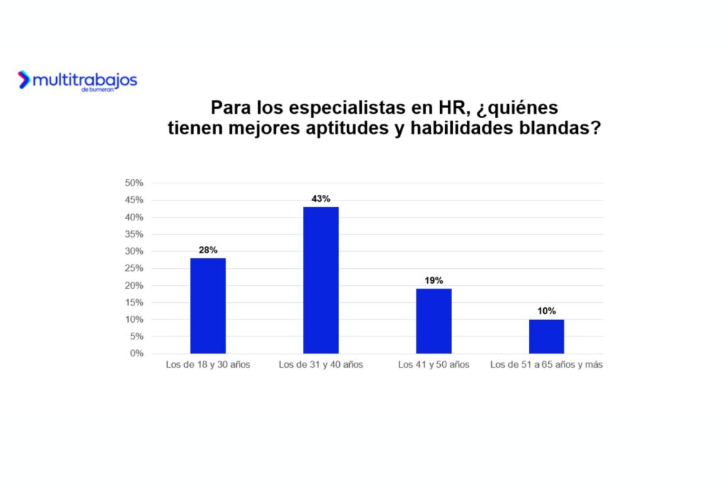 El informe también identifica diferencias generacionales en el desarrollo de competencias. Los profesionales de 31 a 40 años son percibidos como el grupo con mejor preparación integral: el 43% de los especialistas considera que poseen las habilidades blandas más desarrolladas, percepción que se replica regionalmente con 47% en Panamá, 39% en Perú, 34% en Chile y 33% en Argentina. Asimismo, el 41% afirma que este mismo grupo etario destaca en habilidades técnicas, superando a otros rangos de edad y evidenciando que la combinación entre experiencia laboral y adaptación tecnológica fortalece el perfil profesional en etapas intermedias de la carrera.