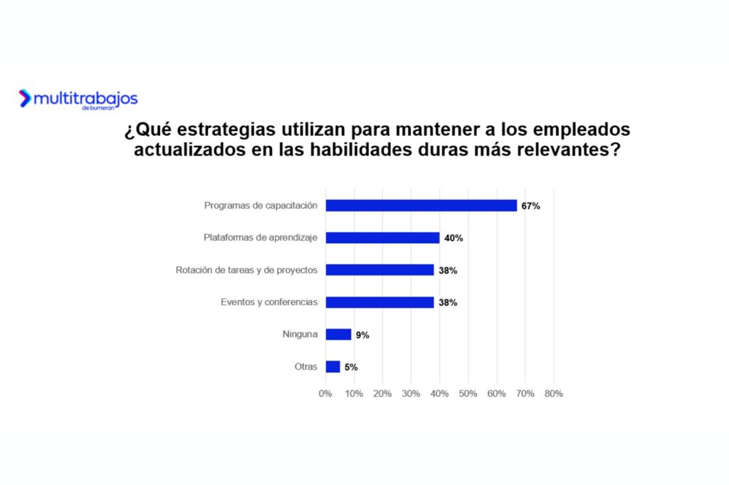Frente a la brecha de habilidades detectada, el 74% de las organizaciones ya implementa acciones para fortalecer las competencias de sus equipos. En el ámbito técnico, las principales estrategias incluyen programas de capacitación (67%), el uso de plataformas de aprendizaje digital (40%), la rotación de tareas o proyectos (38%) y la participación en eventos y conferencias (38%), iniciativas orientadas a mantener actualizado al talento frente a los cambios tecnológicos y las nuevas demandas del mercado laboral.